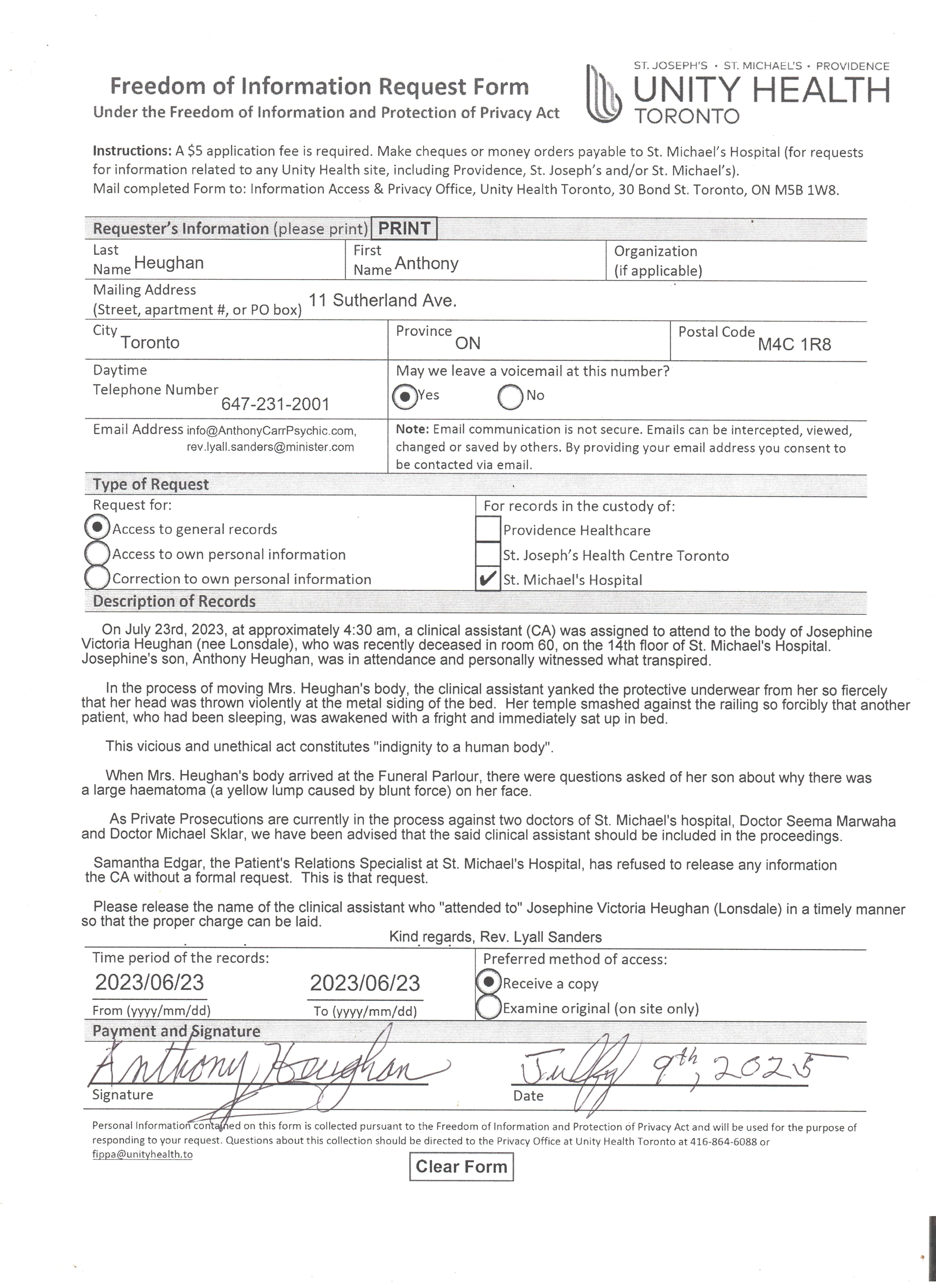 July 9, 2025 — Freedom Of Information Request Form, submitted to St. Murder Hospital to request name of the Clinical Assistant (C.A.), responsible for my mother's "indignity to a dead human body". It is now August 28, 2025, and the requested name still has not been received. Note: There has been a tendency among certain members of the hospital staff, and at the College of Physicians and Surgeons of Ontario (CPSO), as well as the Health Professions Appeal and Review Board (HPARB) to "drag their feet" in this process... (Click here to see what we mean....)